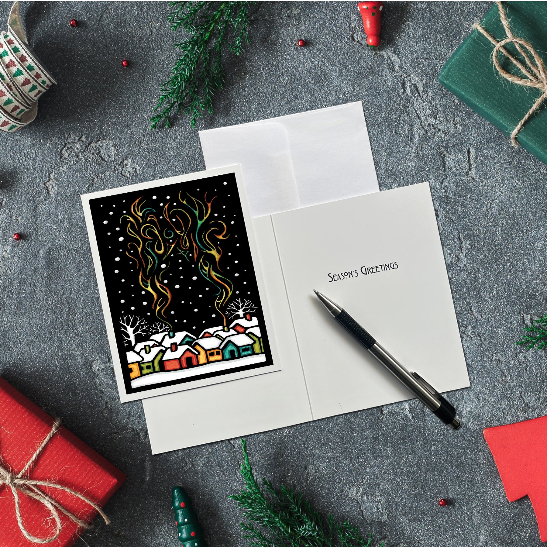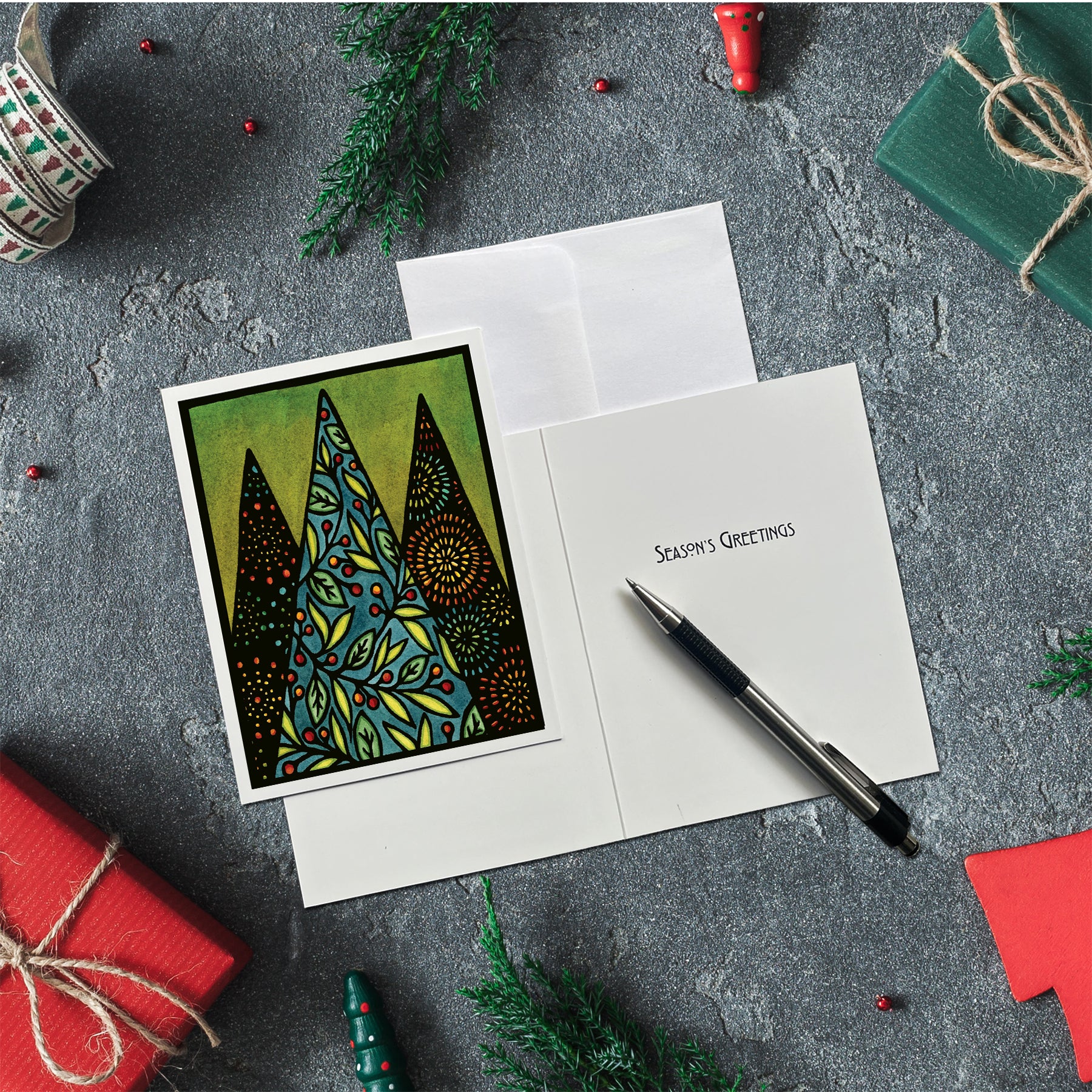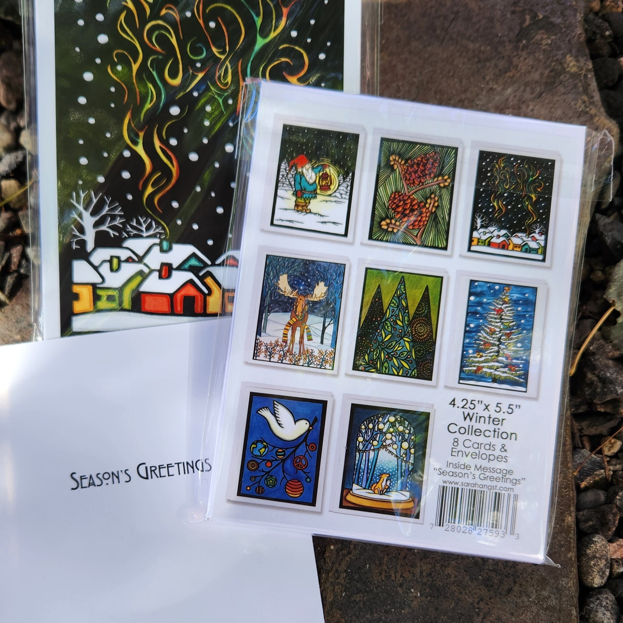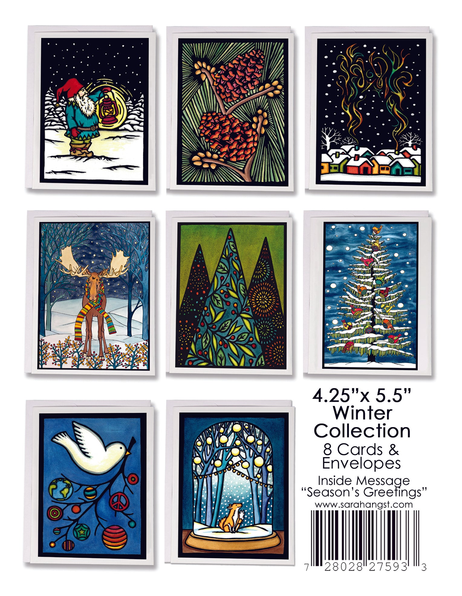 Each individual card measures 4.25" x 5.5". (8) cards per package with envelopes. Inside message: Season's Greetings.